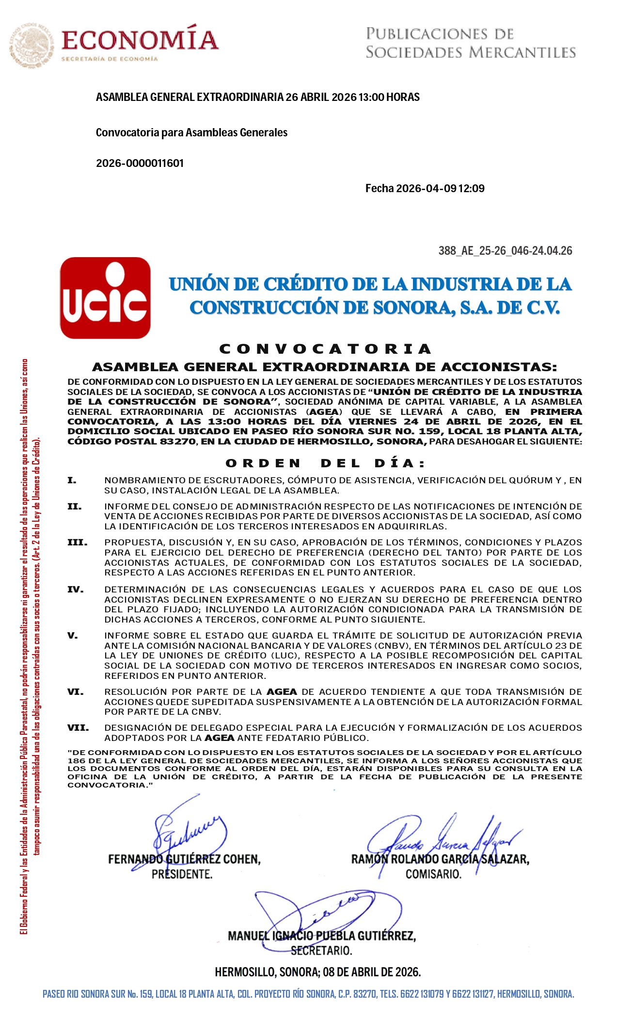 Estimados socios, por este conducto se les informa de nuestra Asamblea general Extraordinaria de accionistas misma que se publicó el día 09 de abril del año en curso, en la página de la Secretaría de Economía en el apartado de PUBLICACIONES DE SOCIEDADES MERCANTILES, en apego a lo establecido por la Ley General de sociedades Mercantiles y a Nuestros estatutos, a celebrarse el día viernes 24 de abril de 2026, a las 13:00 de la tarde en las instalaciones de la UCIC, misma que se adjunta al presente aviso.