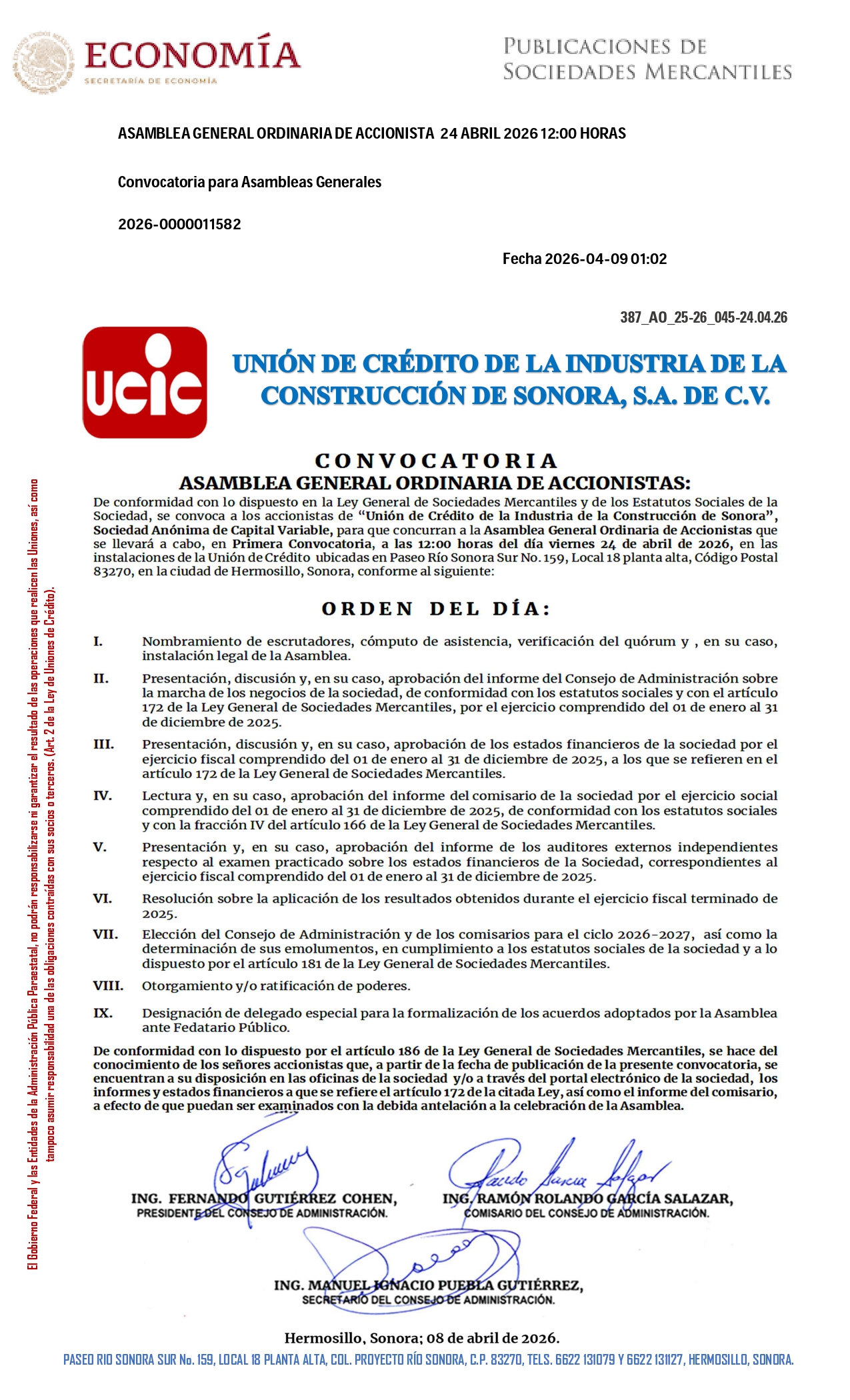 Estimado Socios, por este conducto se les informa de nuestra Asamblea general Ordinaria de Accionistas misma que se publicó el día 25 de marzo del año en curso, en la página de la Secretaría de Economía en el apartado de PUBLICACIONES DE SOCIEDADES MERCANTILES, en apego a lo establecido por la Ley General de sociedades Mercantiles y a Nuestros Estatutos, a celebrarse el día jueves 10 de abril de 2025, a las 12 de medio día en las instalaciones de UCIC, misma que se adjunta al presente aviso.